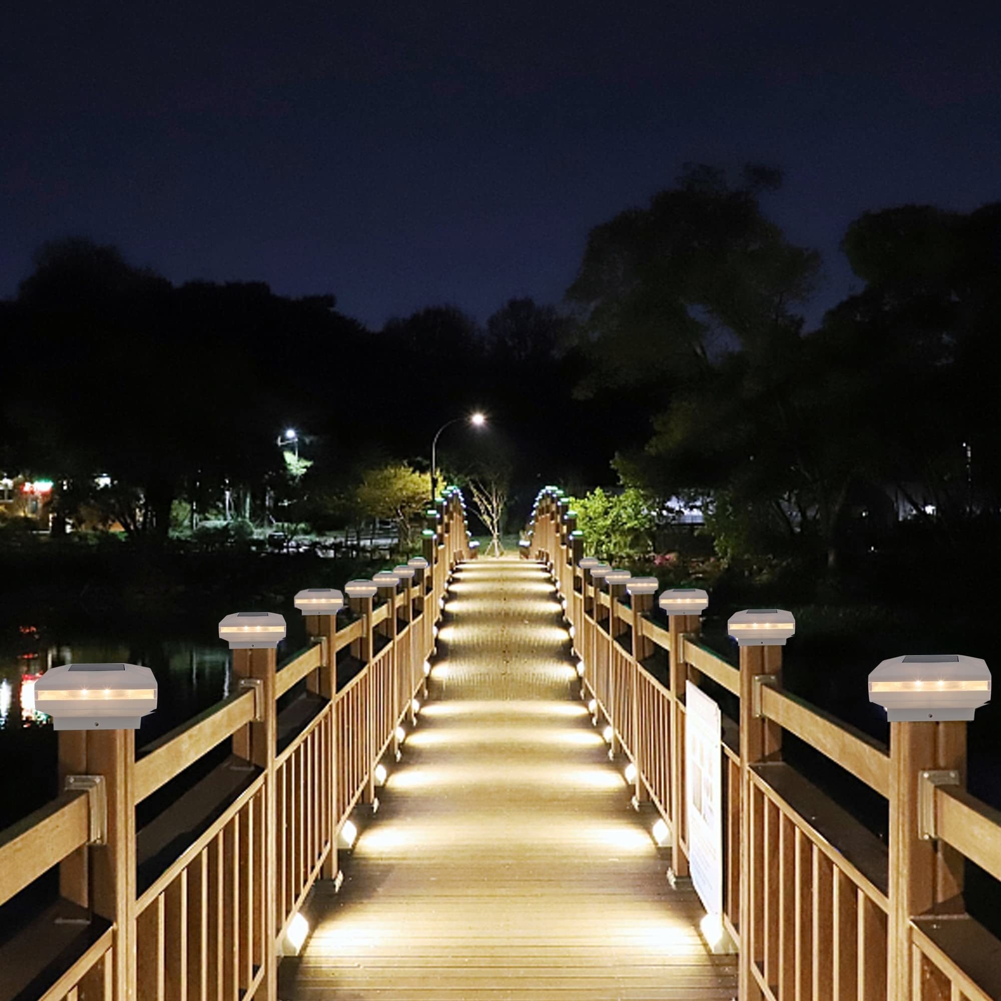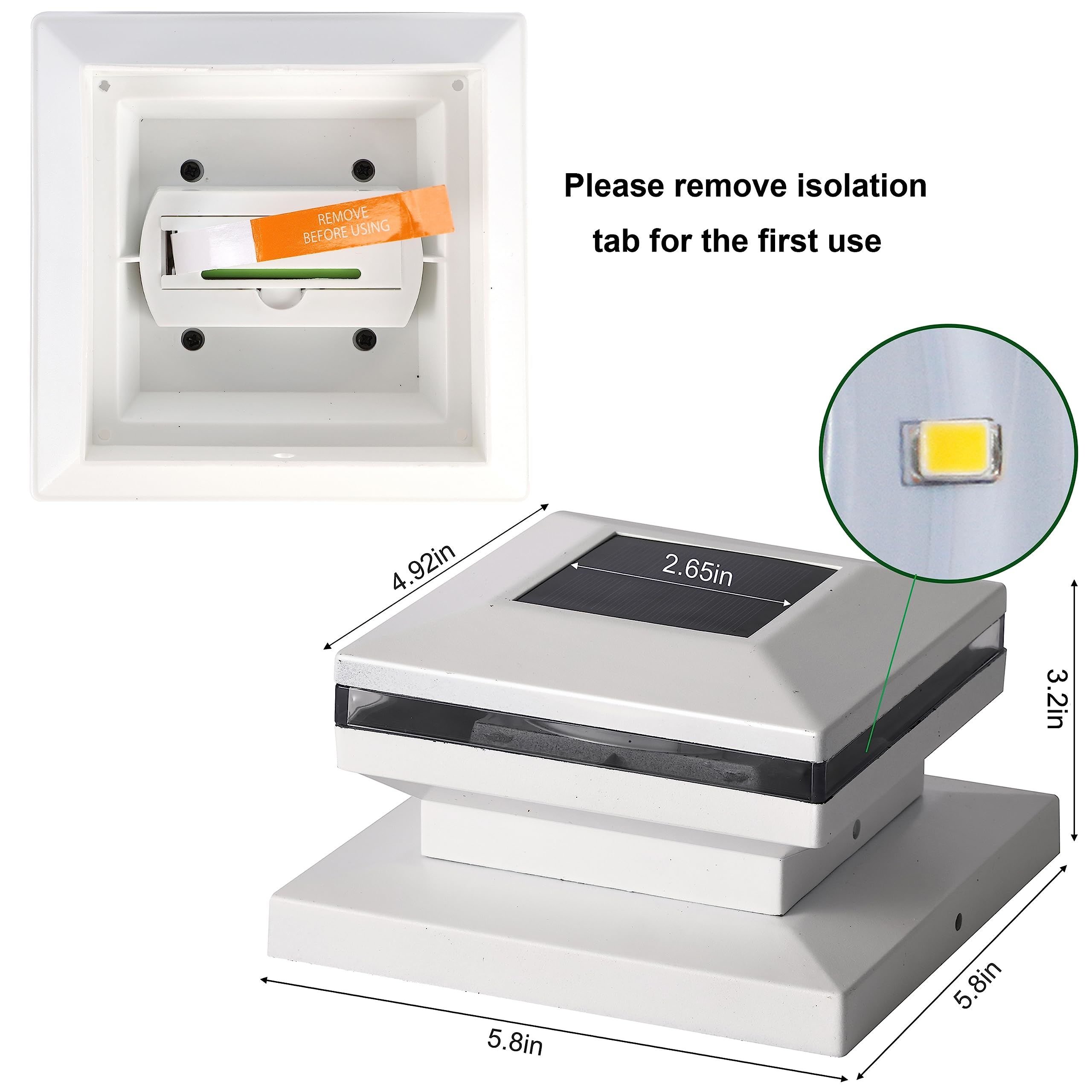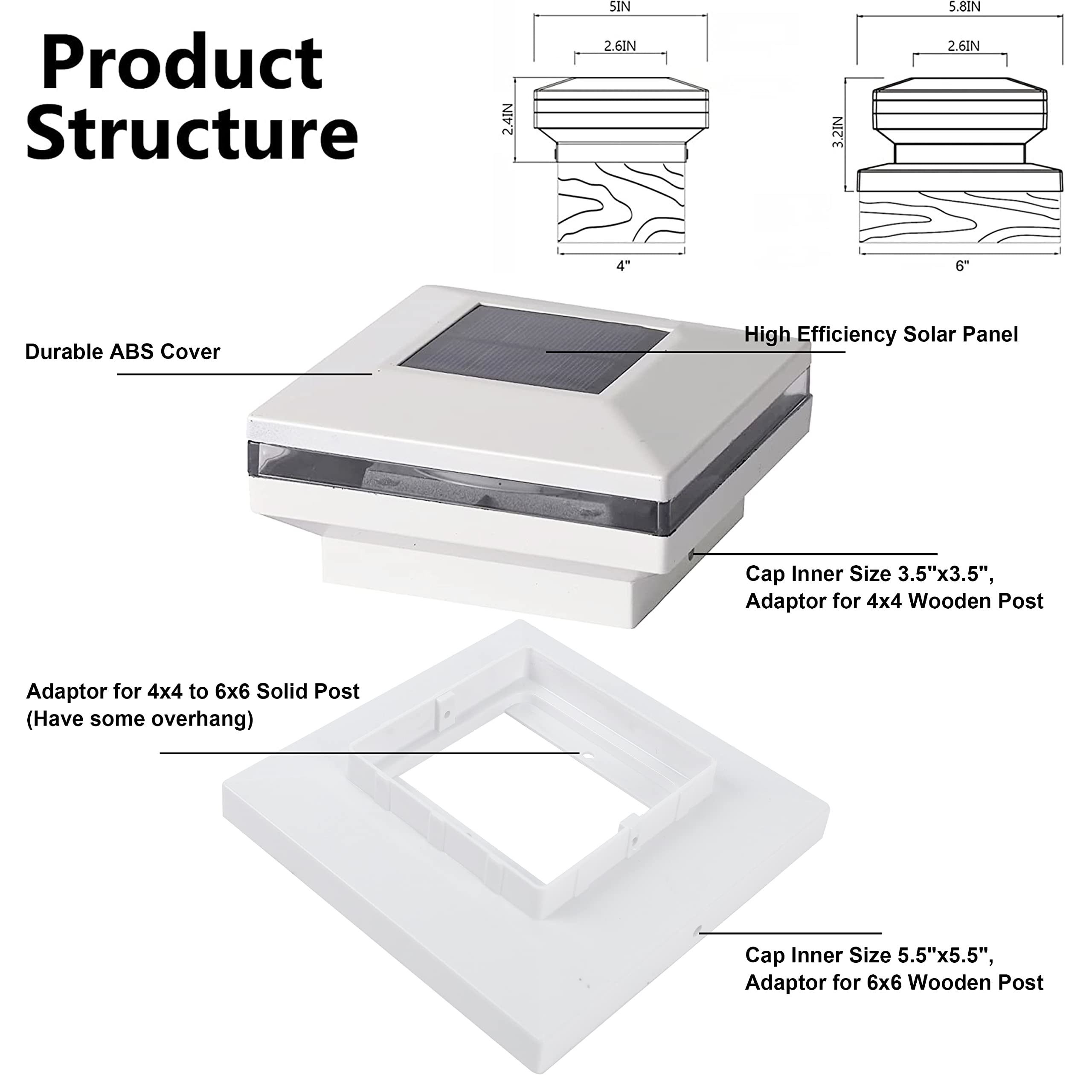 WHITE PLASTIC SHELL SOLAR POST LIGHTS: 8 pack post cap lights powered by solar, each with 8 warm white SMD LED, they are the perfect decorative outdoor lighting and no electricity required. The solar panel supports long-term operations. Add a 360 degree viewing angle illuminate charming to your garden, decorate your fence, deck, porch or yard. Measurement: 5.8 x 5.8 x 3.2 inches