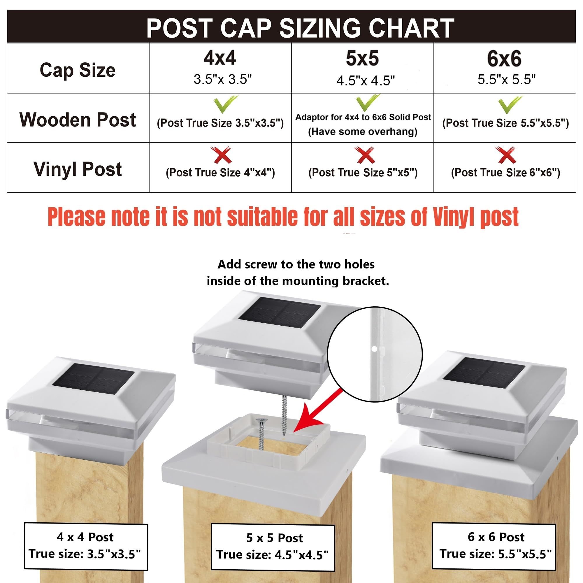 EASY TO ASSEMBLE: Complete with detailed instructions. Comes with 2 different sized caps with 3.5'x3.5' and 5.5'x5.5' inner size, suits for 4x4 and 6x6 square wooden post caps. For the 5x5 wooden post(or solid post between 4x4 and 6x6), just add screw to the two holes inside of the large cap, the cap is designed to be slightly large, so a overhang will appear around the perimeter of the post. It is important to note that the product is not suitable for all sizes of vinyl posts