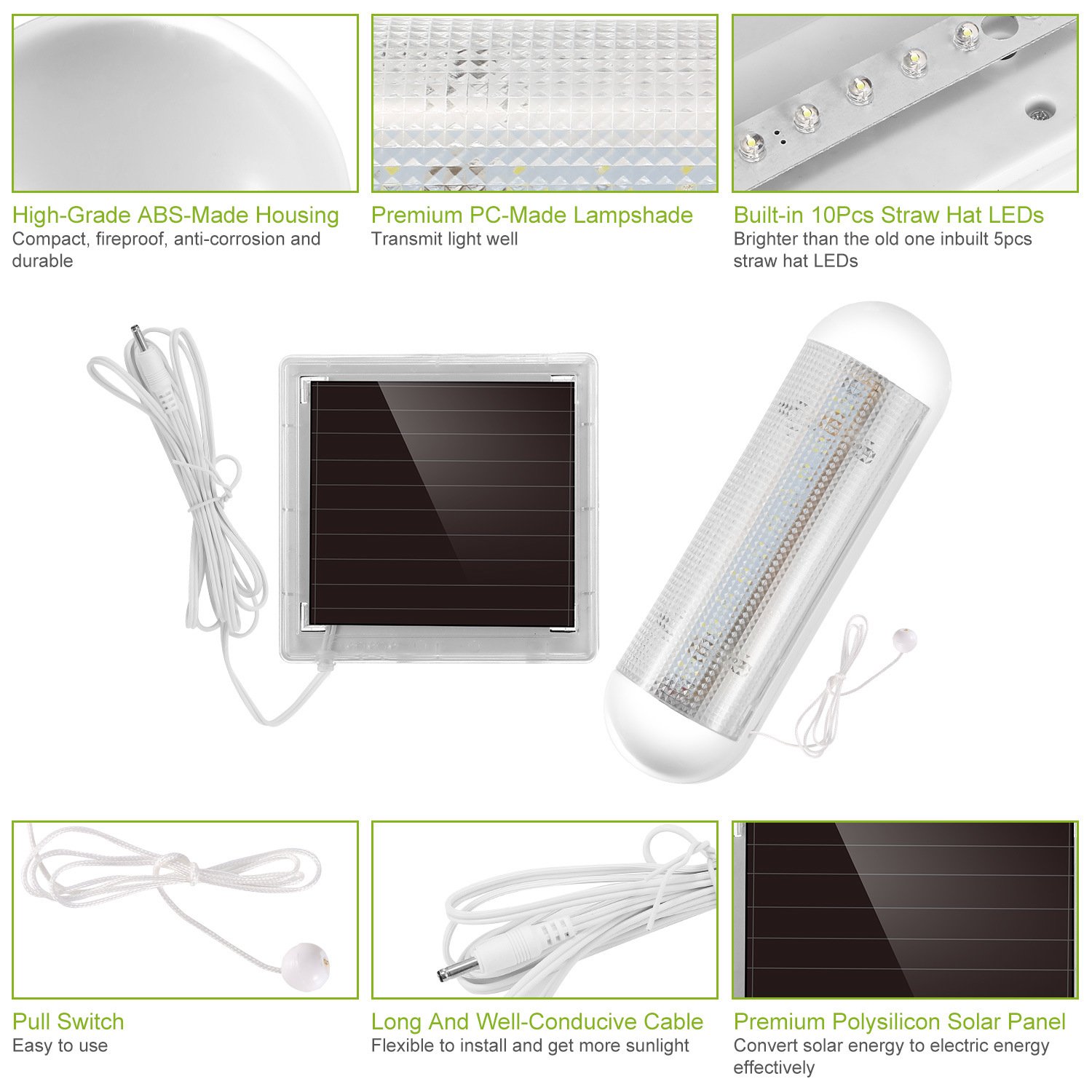 Material: ABS (LED Light Housing) + PC (Lampshade) + Amorphous-Silicon (Solar Panel)