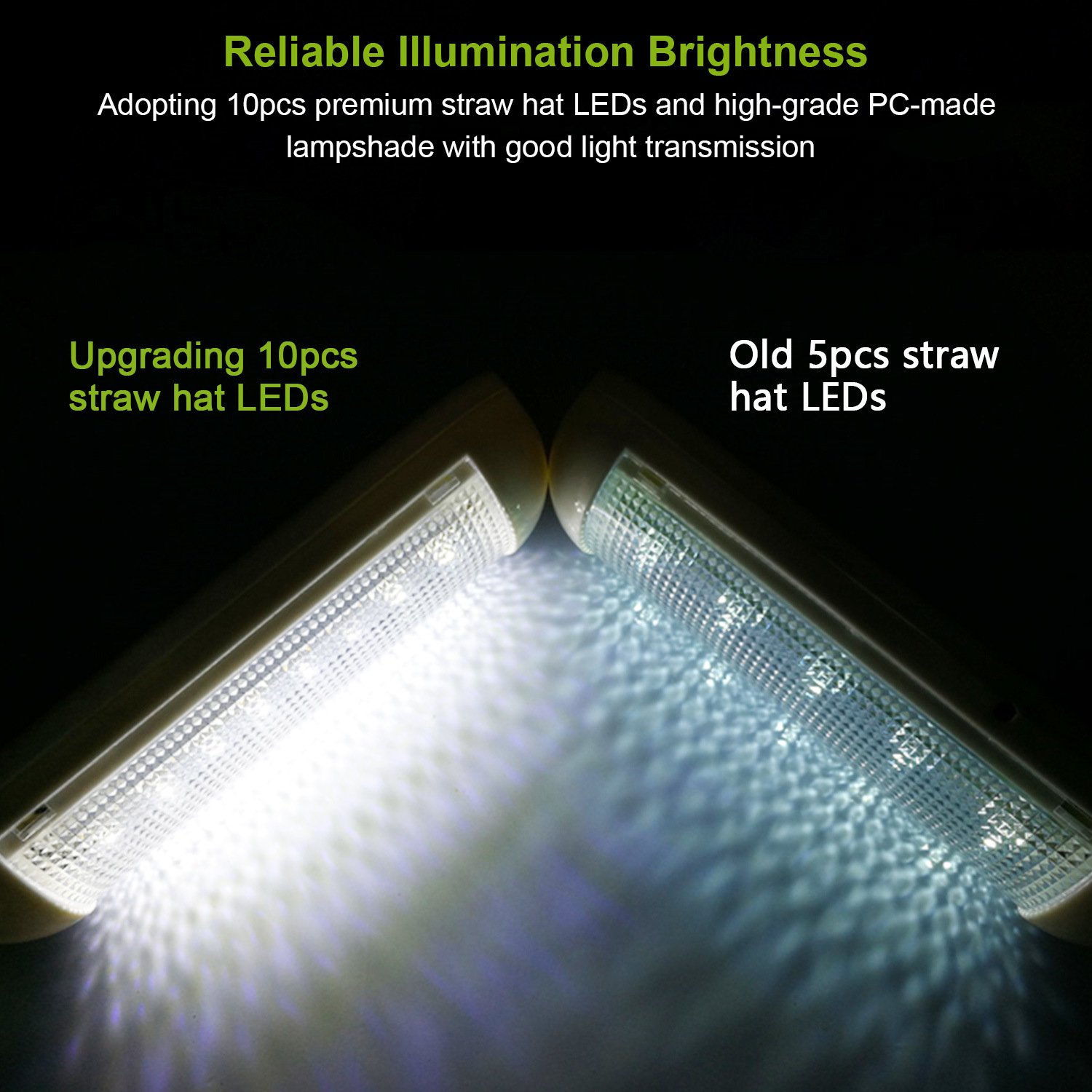 *Reliable Illumination Brightness*:Adopting 10pcs premium straw hat LEDs and high-grade PC-made lampshade with good light transmission,our brightness of our upgrading LED light is much lighter than the old one inbuilt 5pcs straw hat LEDs.(Note:The brightness of our LED light is better for the illumination of shed,garage,store room and tool room or some emergency illuminations,reading or something like that are not recommended.)